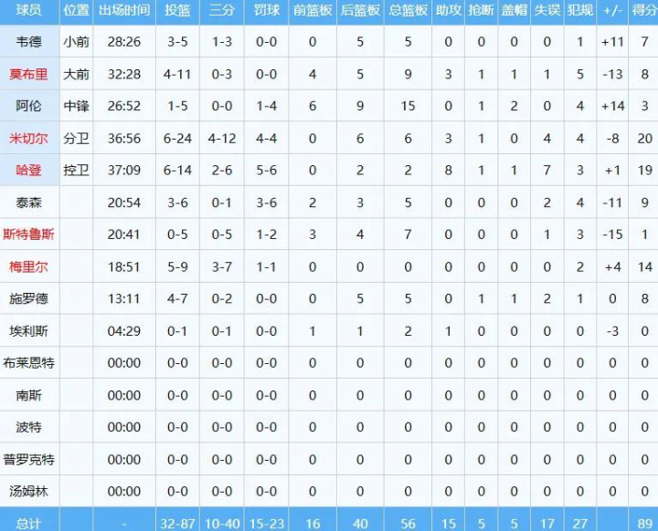哈登投篮14中6拿下19分8助同时出现7次失误,米切尔出手24次仅中6球狂打18铁只换回20分外加6板3助。